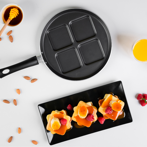 Erleben Sie kreatives Kochen mit unserer vierfachen Crêpe‑Pfanne in smaragdgrün. Dank ihrer vier quadratischen Mulden (je ca. 8 cm) können Sie simultan Mini‑Baghrir, Crêpes oder Pancakes zubereiten – ideal für Familien, Brunches oder schnelle Snacks.